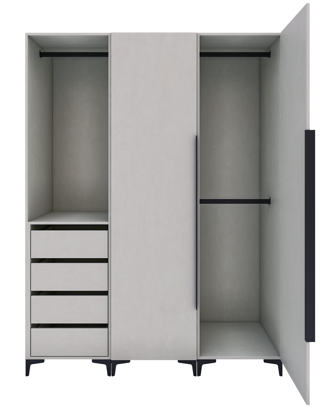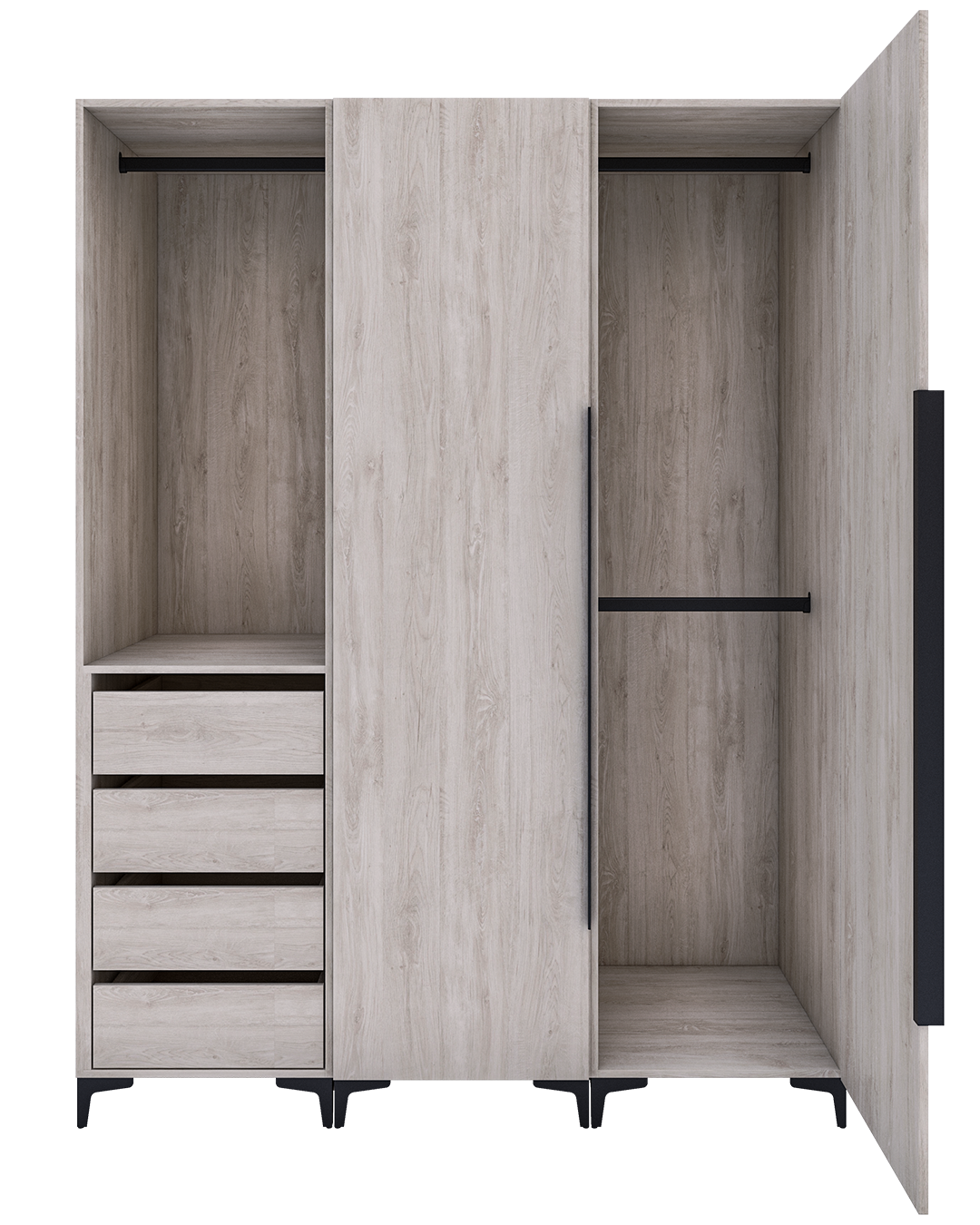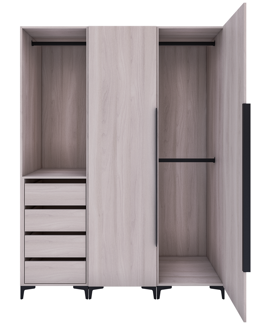 - Diseño de Madera Nogal en tonalidad blanca con algunos toques beige y gris claro que le dan movimiento entre sus medias catedrales. Este moderno diseño es ideal para dar amplitud a cualquier espacio.