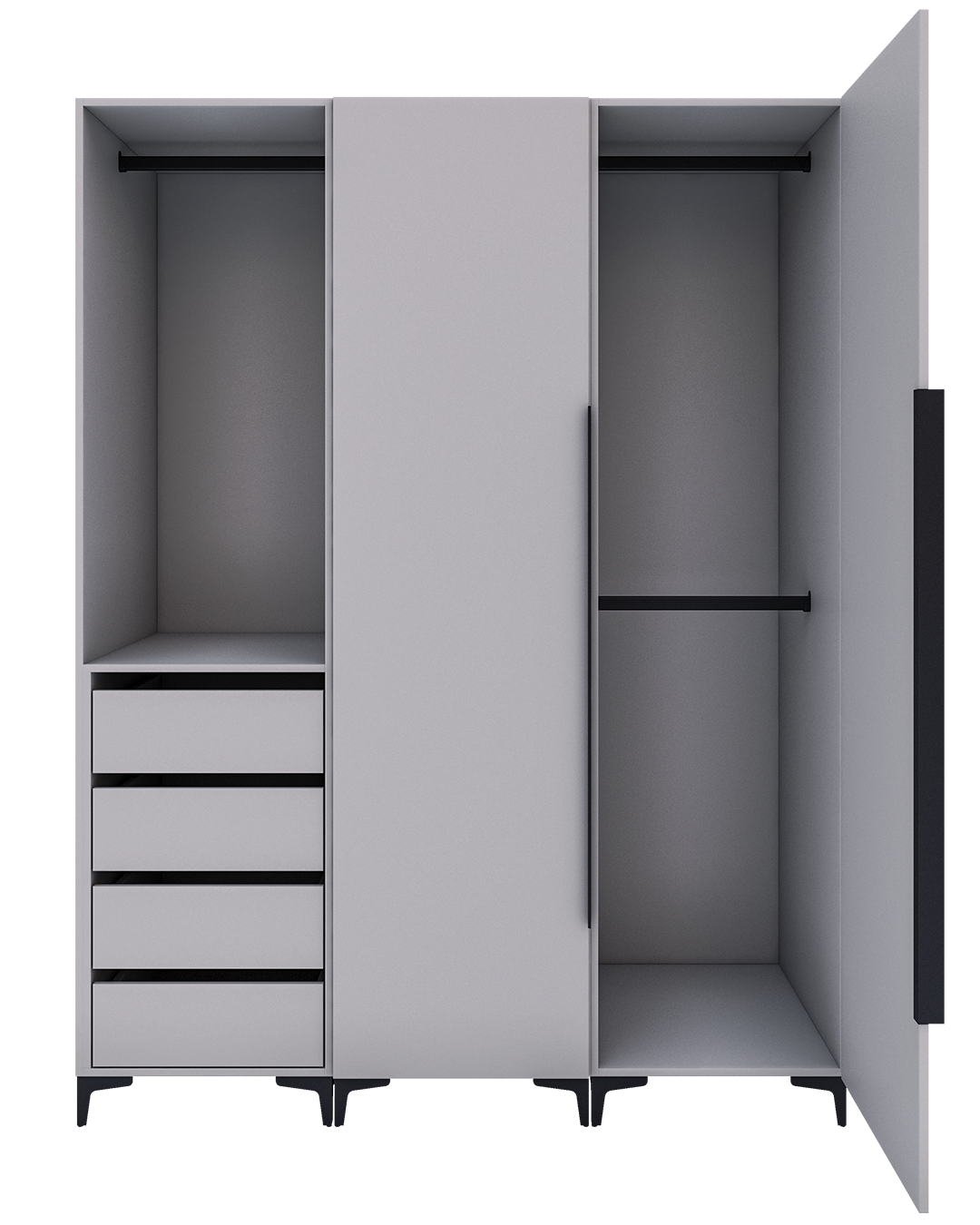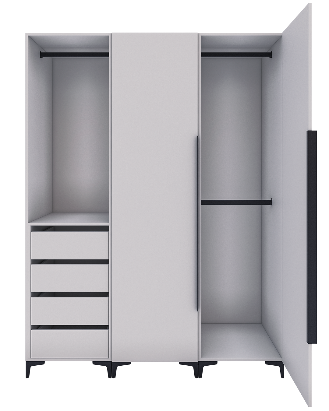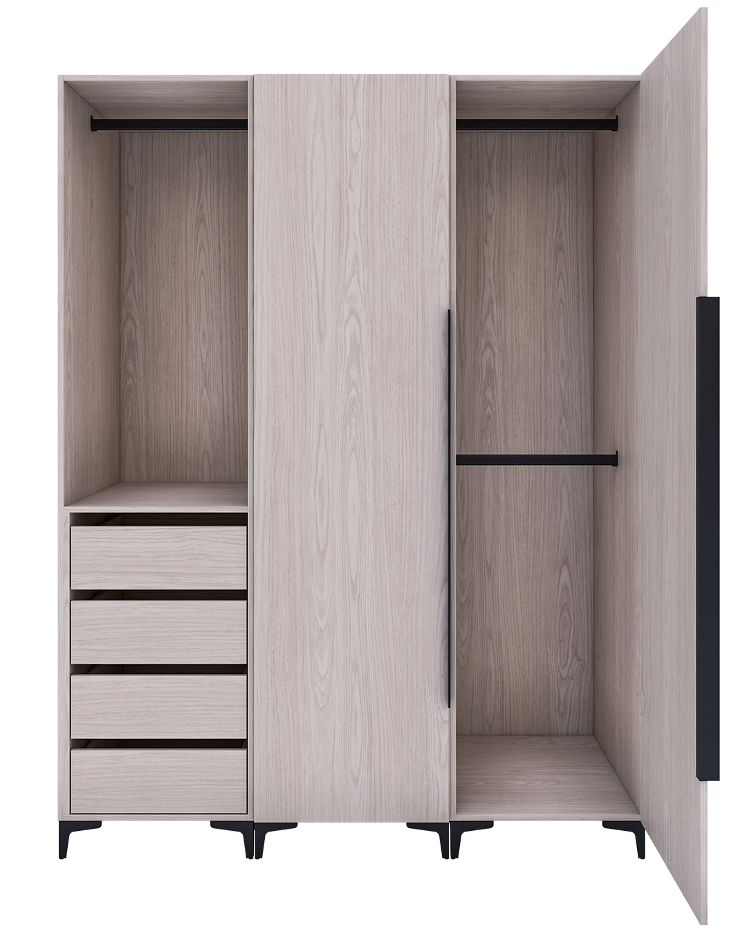 - Diseño de Madera Nogal en tonalidad blanca con algunos toques beige y gris claro que le dan movimiento entre sus medias catedrales. Este moderno diseño es ideal para dar amplitud a cualquier espacio.